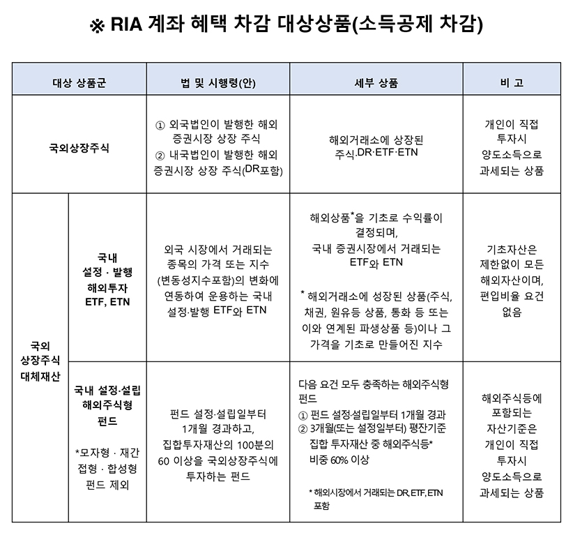 ☞ RIA가 아닌 다른 금융계좌에서 순매수 시 RIA의 세제혜택 축소 대상이 되는 금융상품은 '국내에서 설정·설립된 해외주식형 펀드(펀드재산의 60% 이상을 해외상장주식에 투자)', '해외주식(국외상장주식)', '국내 설정·발행 해외투자 ETF.ETN'입니다. <아래 표 참고>